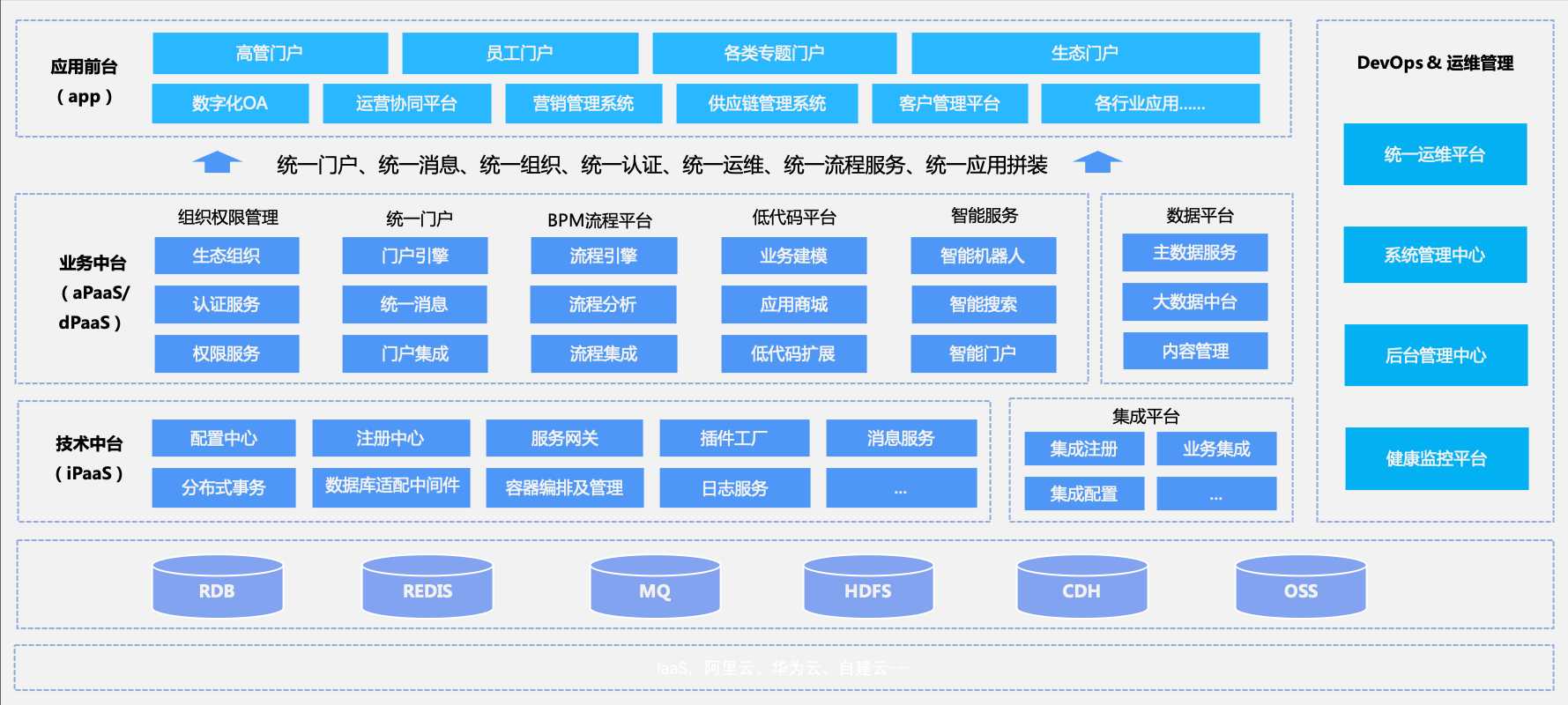 蓝凌MK-PaaS平台,基于“封装业务能力”(Packaged Business Capability,简称PBC)理念构建,具备微服务、多云多端、组装式等特点,能支撑企业统一门户、统一消息、统一组织、统一认证、统一运维、统一流程服务、统一应用拼装,将传统OA及业务系统全面升级为组装式PaaS。