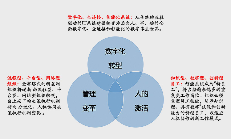 智慧组织是指在数字经济时代,以与客户、员工、合作伙伴等共同体的共创共赢为目标,通过人工智能、大数据、云计算、物联网等新技术实现组织业务全价值链、管理全层级的深度融合应用,通过数字技术驱动组织创新发展,增强对经营环境与市场需求变化的自适应能力的一种新组织形态。构建智慧组织,需要从数字化转型、管理变革和人的激活这三个维度统筹规划、整体推进。