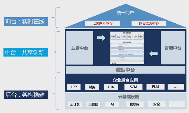 蓝凌认为:业务中台以客户为中心,管理中台以员工为中心,数据中台作为基础支撑,“业务中台+管理中台+数据中台”的三中台模式将可以全面支撑全企业数字化转型落地。