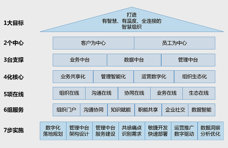 蓝凌数字化转型规划将充分借鉴阿里中台战略及企业级互联网架构能力,以打造智慧组织为目标,以1234567为指导方法论。