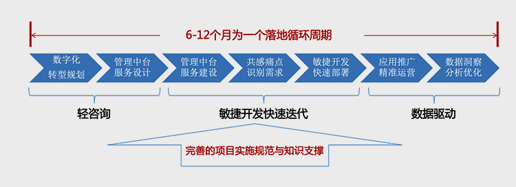 采用轻咨询方式,形成数字化转型规划和管理中台服务设计,并以此为指引,按6-12个月为落地循环周期方式,以敏捷开发快速迭代方法实现应用落地,并以数据驱动方式实现闭环分析和优化改进。