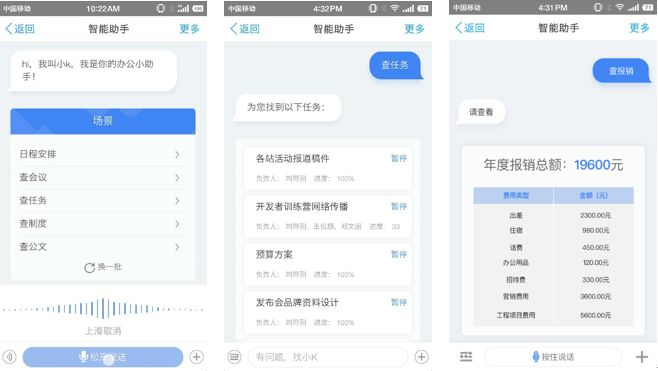 让小K机器人作伴,100+智能办公场景,支持语音打开待办、建流程、呼邮件、唤日程、调专家……查看薪资、假期、报销、业绩等,随叫随到,体验全新、便捷、高效工作。