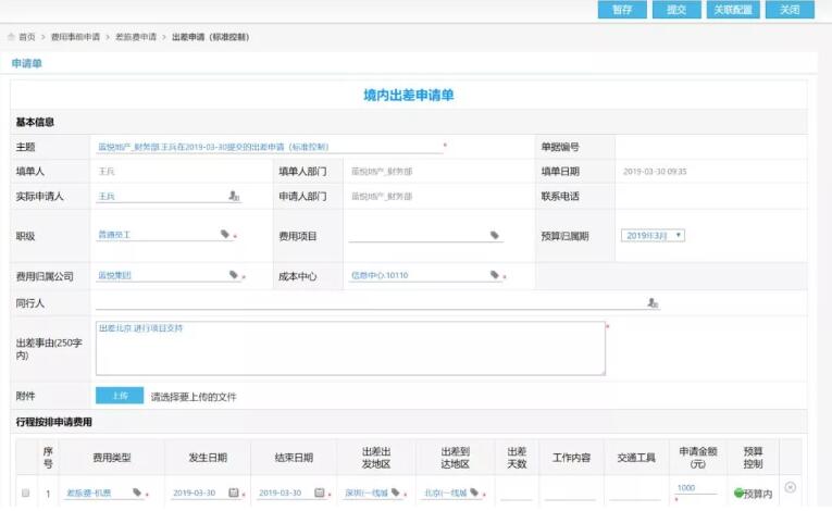 申请时进行预算判断、同时进行标准控制,标准设定刚柔控制,刚性控制是超标不允许提交申请,柔性则可提交,有合规提醒。