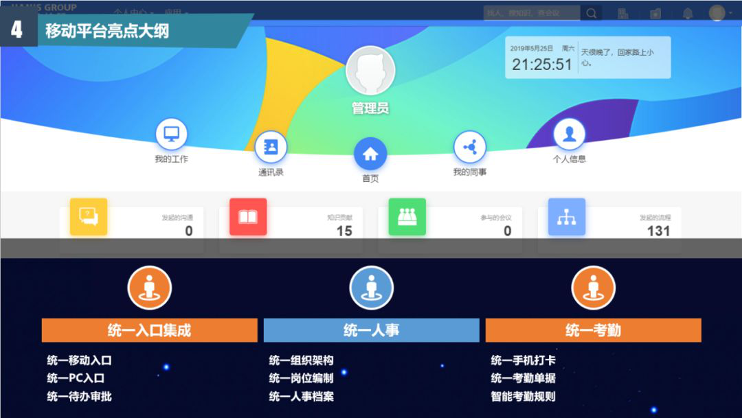 新平台亮点较多,主要体现在以下几个方面:统一入口集成(统一移动入口、统一PC入口、统一待办审批)、统一人事(统一组织架构、统一岗位编制、统一人事档案)、统一考勤(统一手机打卡、统一考勤单据、智能考勤规则)。