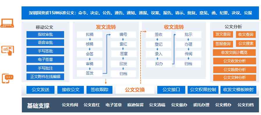 支持《党政机关公文格式》(GB/T 9704-2012)规定的15类公文的起草,涵盖拟稿、核稿、审稿、签发、编号、排版、打印、分发、归档等工作,结合移动审批,规范又便捷。