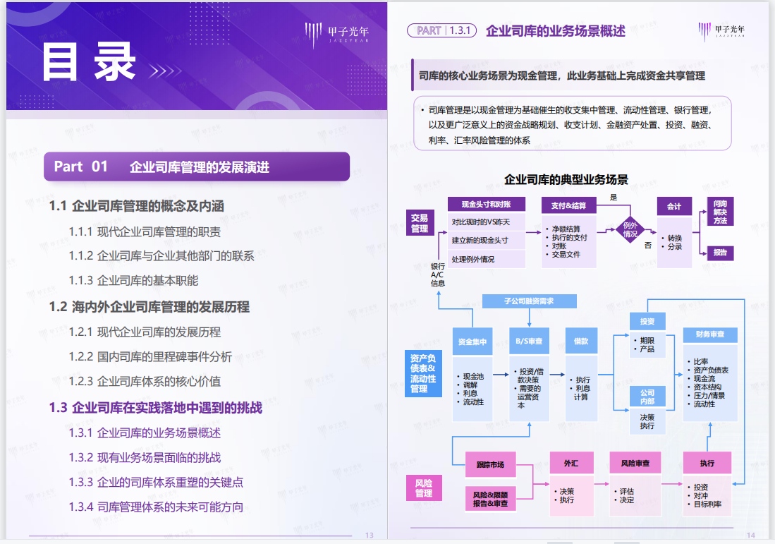 报告介绍了企业司库管理的发展演进,数字经济时代下,企业司库管理作业体系的变化,以及企业司库管理及相关产品服务的落地实践。