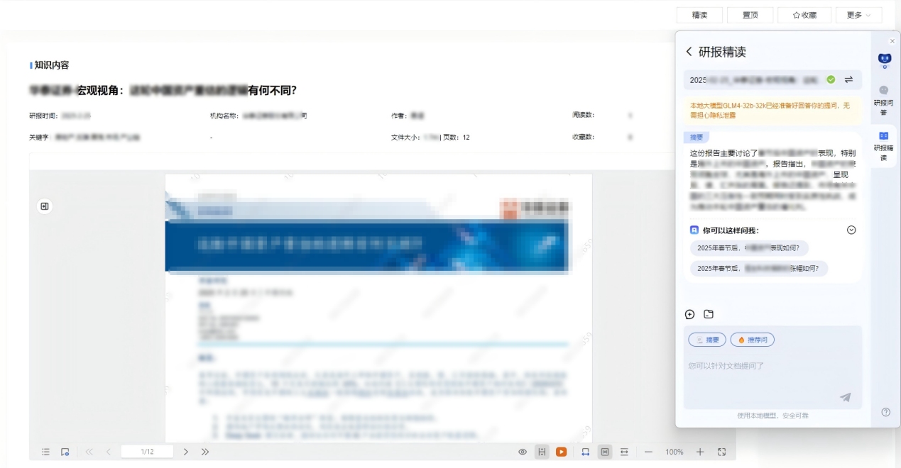 构建研报智能问答助手,支持口语化提问与精准意图理解,依托大模型快速提炼研报核心要点,以清晰直观的形式呈现关键结论,让复杂信息一目了然。同时提供研报精读功能:自动生成内容摘要与全文总结,帮助用户高效掌握知识精髓;基于研报内容智能推荐关联性问题,引导用户挖掘潜在信息点,提升对专业研报的理解。