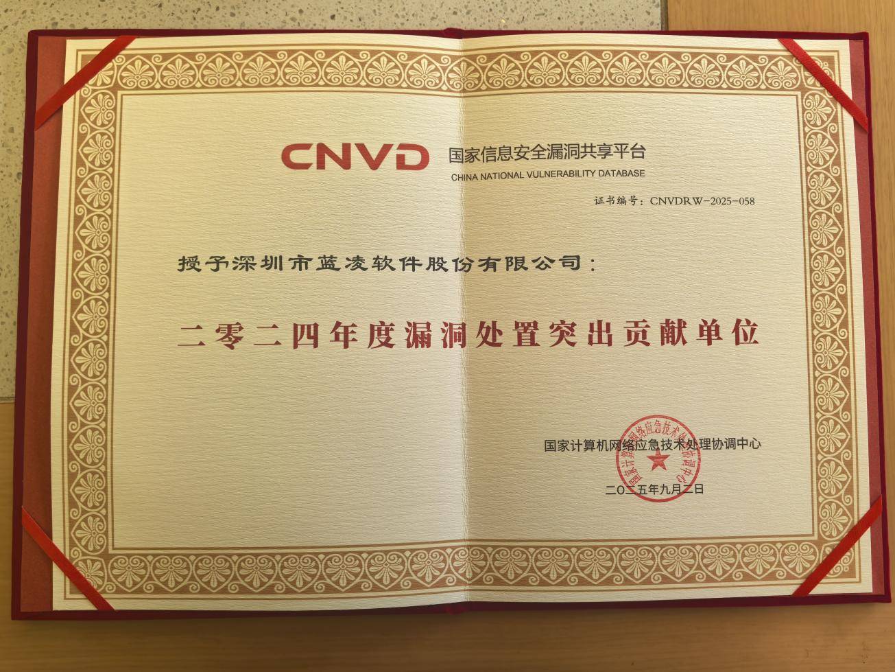 会上,国家计算机网络应急技术处理协调中心正式揭晓了2024年度国家信息安全漏洞共享平台(CNVD)优秀单位名单,蓝凌软件凭借在网络安全漏洞处置领域的卓越表现,成功荣获 “2024年度漏洞处置突出贡献单位”称号,成为企业协同办公及数智化领域获此殊荣的代表性企业。