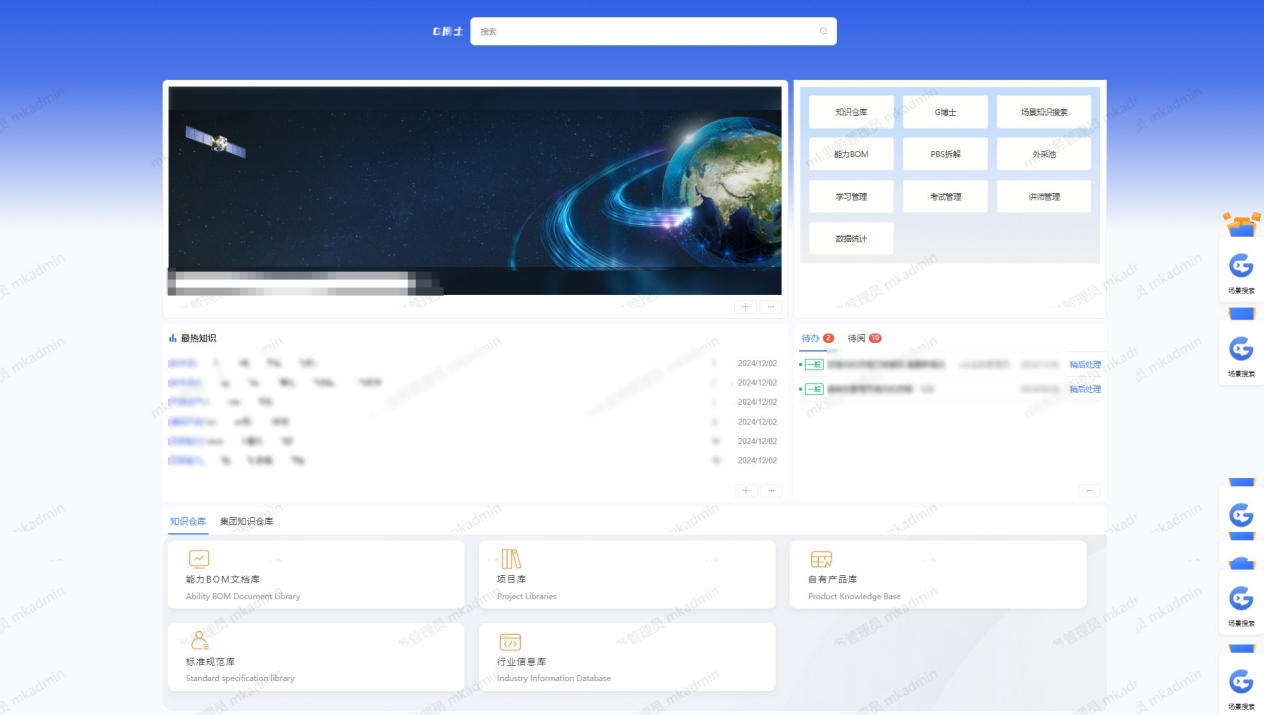 知识门户作为平台的核心入口,汇集了集团各大知识库(包括能力BOM文档库、项目库、标准规范库、行业信息库等)、知识地图、最新知识等,支持全文检索、场景搜索等功能,员工可快速获取所需知识。