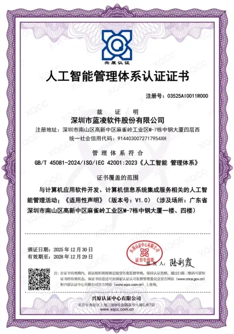 蓝凌软件正式通过权威认证机构审核,获得ISO/IEC42001人工智能管理体系认证证书,标志着其在人工智能技术研发、应用及管理领域已接轨国际领先水准,为企业级AI应用的安全、可信、可持续发展提供坚实保障。