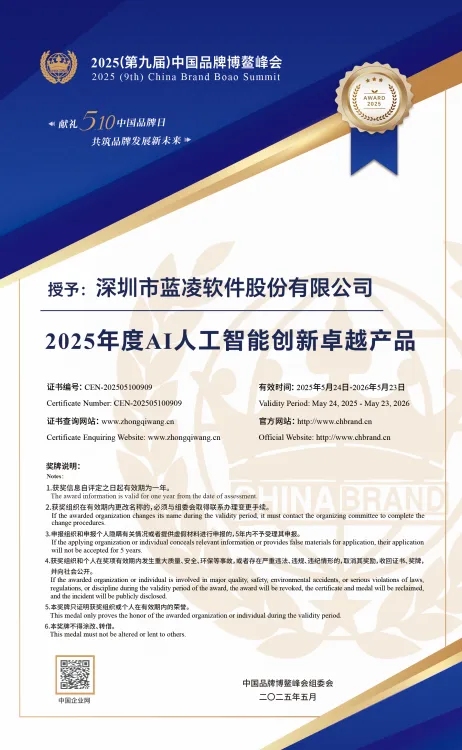 在第九届中国品牌博鳌峰会上,蓝凌软件凭借在AI领域的技术优势与创新活力,荣膺“2025年度AI人工智能创新卓越产品”奖项,彰显了其在品牌建设与AI产品创新方面的双重实力。