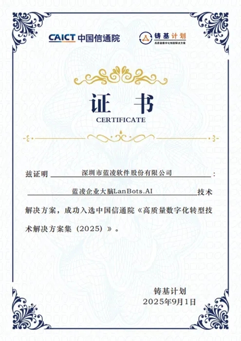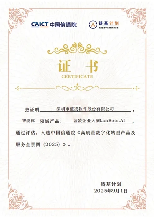 蓝凌LanBots.AI智能体平台凭借领先技术实力与成熟落地能力,成功入选中国信通院《高质量数字化转型产品及服务全景图(2025上半年度)》,同时跻身《高质量数字化转型技术解决方案集(2025)》,获得国家级权威机构的专业认可。