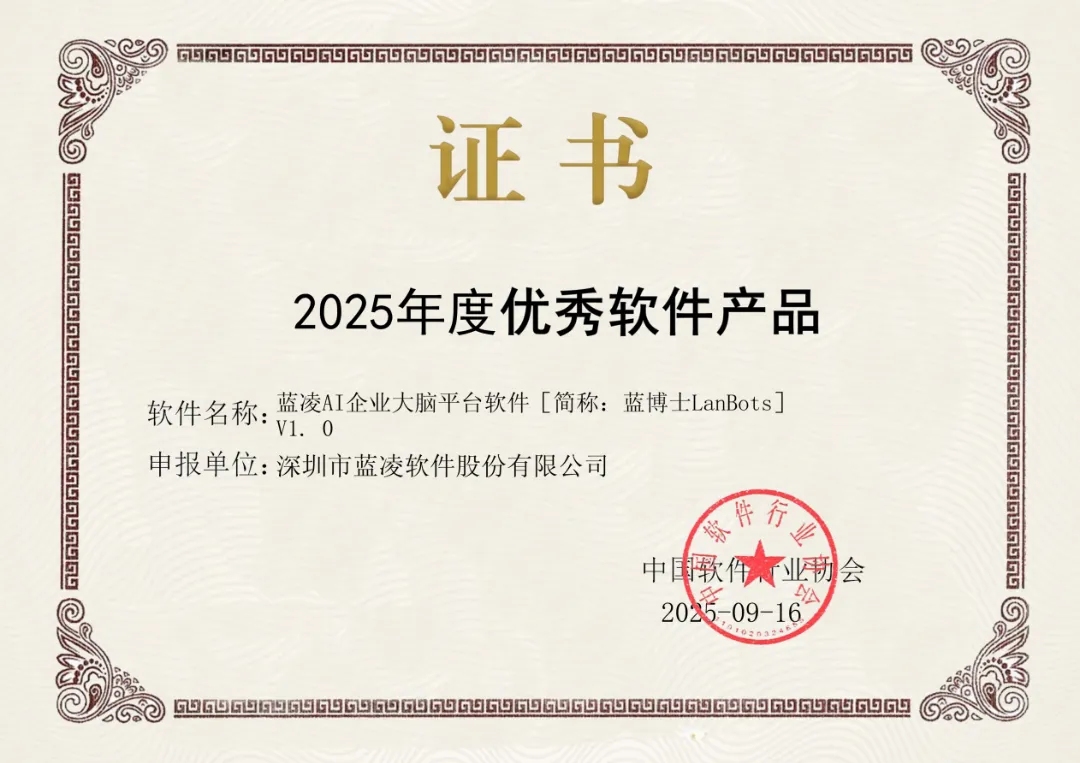 蓝凌软件LanBots.AI智能体平台凭借卓越的技术实力与广泛的市场应用价值,获评中国软件行业协会“2025年度优秀软件产品”。这既是对公司技术创新能力的认可,也是对其在数字化转型领域贡献的高度肯定。
