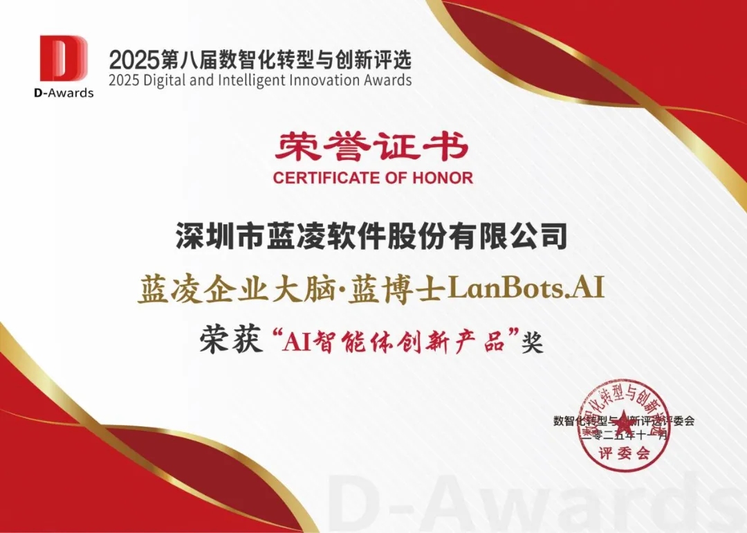 在数字产业创新研究中心、锦囊专家、首席数字官等机构联合举办的第八届数智化转型与创新评选(D-Awards)中,蓝凌LanBots.AI智能体平台凭借领先的技术架构、丰富的落地场景与显著的应用价值,成功摘得“AI智能体创新产品”大奖。