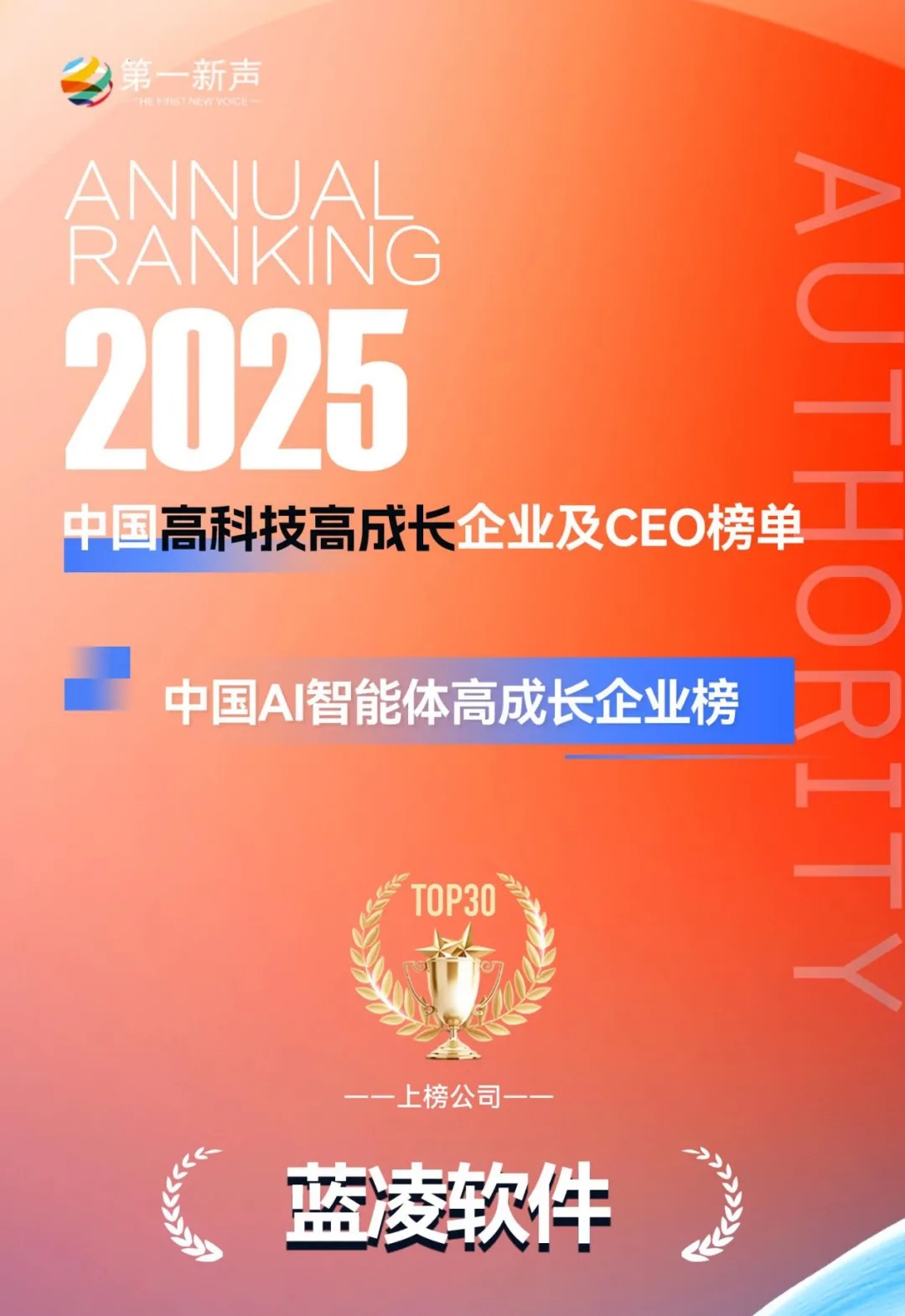 在第一新声发布的“2025年度中国AI智能体高成长企业榜TOP30”中,蓝凌软件成功登榜,这一荣誉是市场对其在AI智能体领域持续创新能力与高速发展潜力的有力佐证。