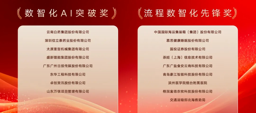 现场还揭晓了第七届“寻找数智化标杆”先锋企业&人物名单,来自能源、金融、制造等行业的特变电工、国投证券、太重集团、茶百道、霸王茶姬等近百家企业及CIO斩获荣誉,表示将与蓝凌继续携手共创AI数智化新价值。