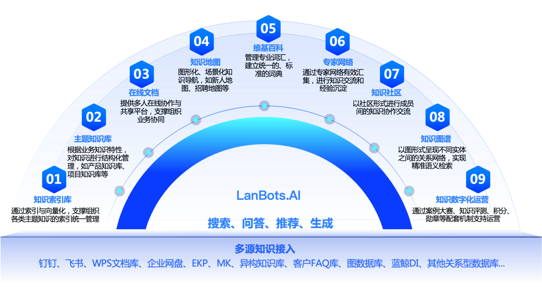 内置常用知识源:内置超过10种常见企业内部知识源,企业可直接快速接入