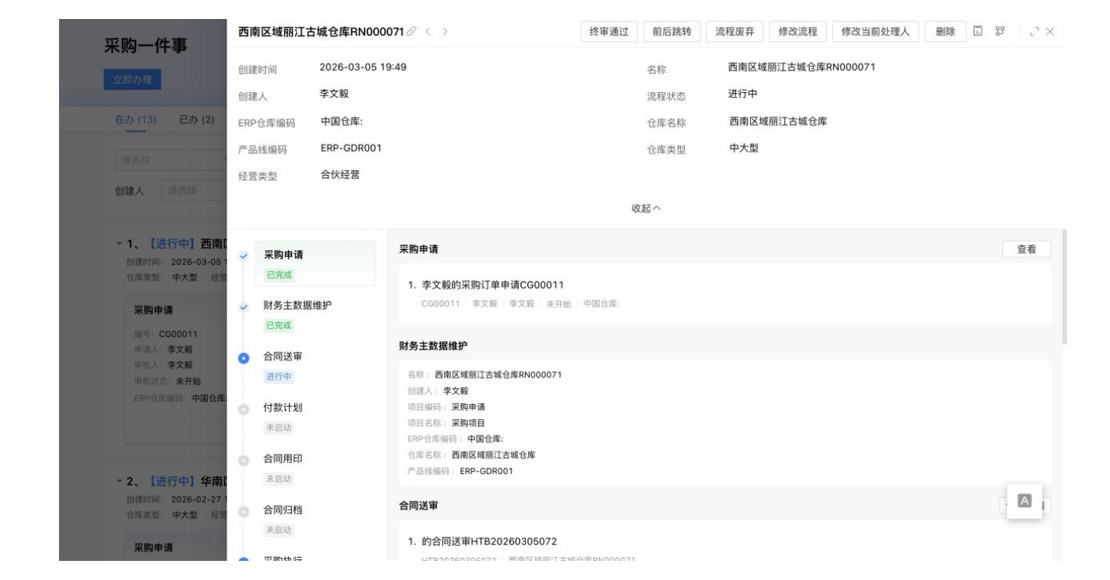 管理者可查看整个业务的全局,每个环节、每个流程的状态、进展及相关的情况